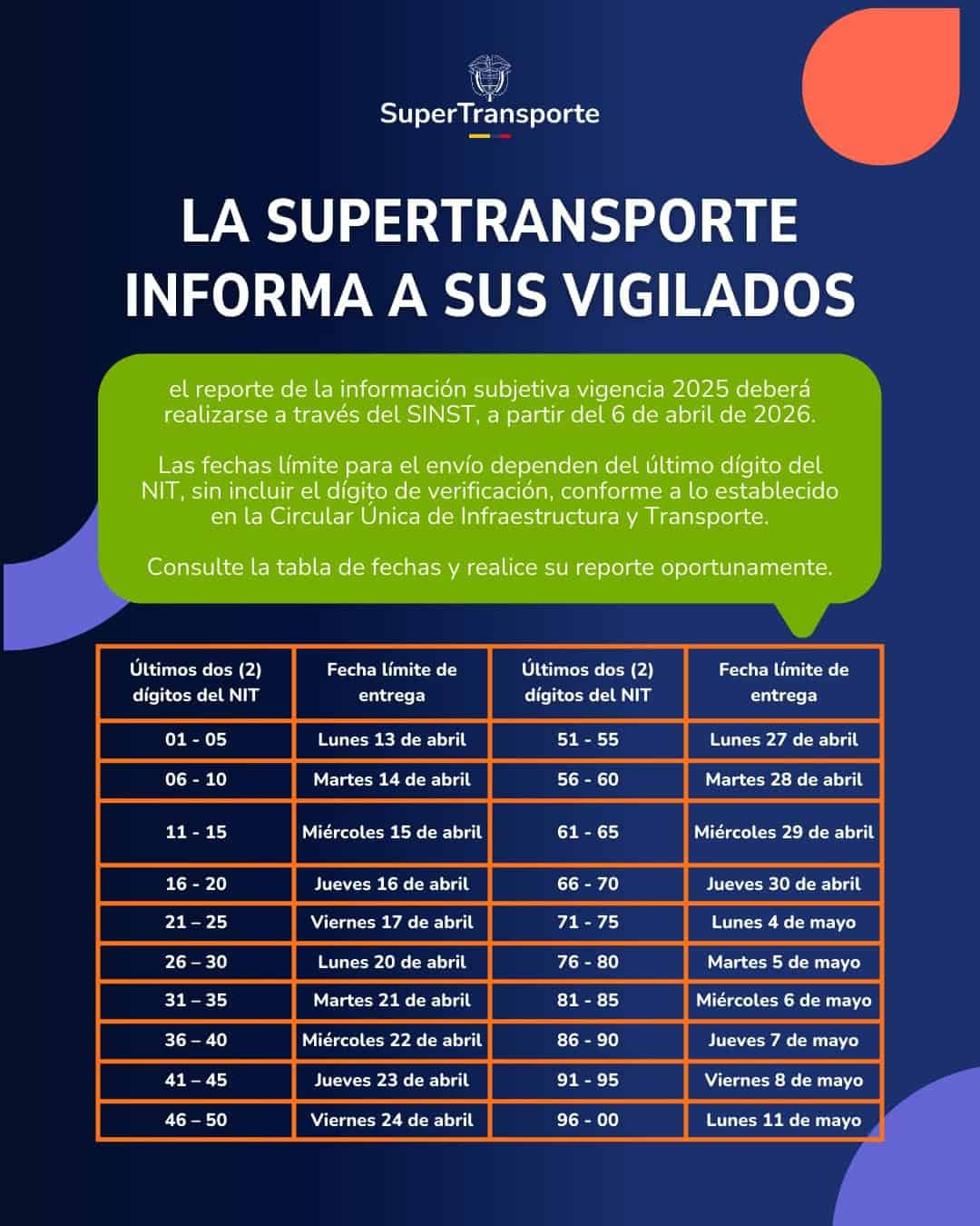 La Supertransporte informa a sus vigilados, que de conformidad con lo indicado en la “Circular Única de Infraestructura y Transporte”, así como en las normas que la modifiquen o adicionen, la información subjetiva de la vigencia 2025, deberá ser reportada a través del Sistema Inteligente Nacional de Supervisión al Transporte – SINST, desde el 6 de abril de 2026 y las fechas límites determinadas de acuerdo con los dos (02) últimos dígitos del NIT, sin tener en cuenta el dígito de verificación.