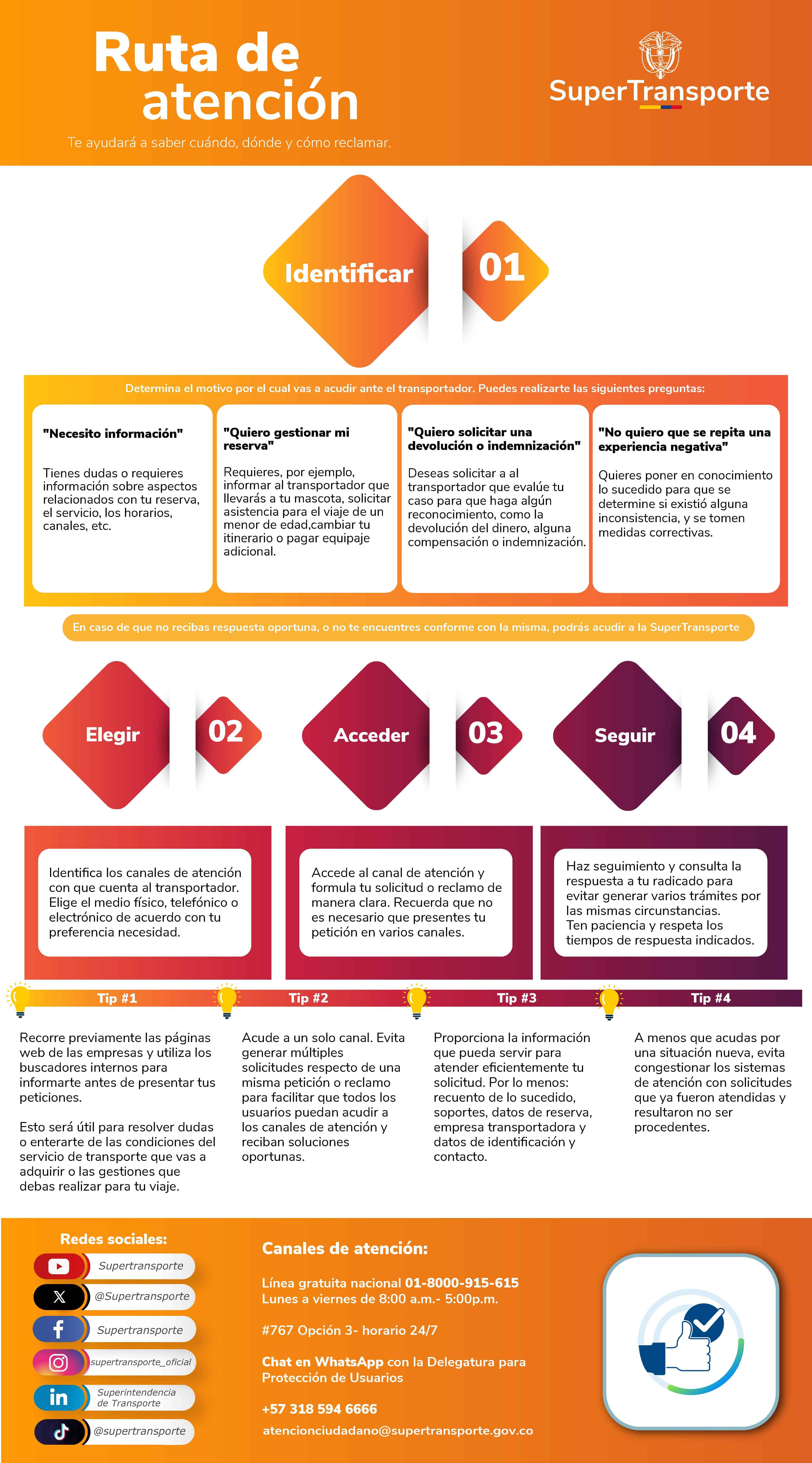 Recuerde que podrá presentar la queja por cualquiera de los canales destinados para ello, con el fin de que esta entidad verifique si la empresa transportadora o intermediario ha incumplido con las normas relacionadas con los derechos de los usuarios del transporte aéreo. Esto busca la protección del interés general y está orientado al ejercicio de la facultad sancionatoria de la Superintendencia. Por esta vía no se determina el interés particular y concreto, por ejemplo, en materia de devoluciones o reembolsos de dinero.